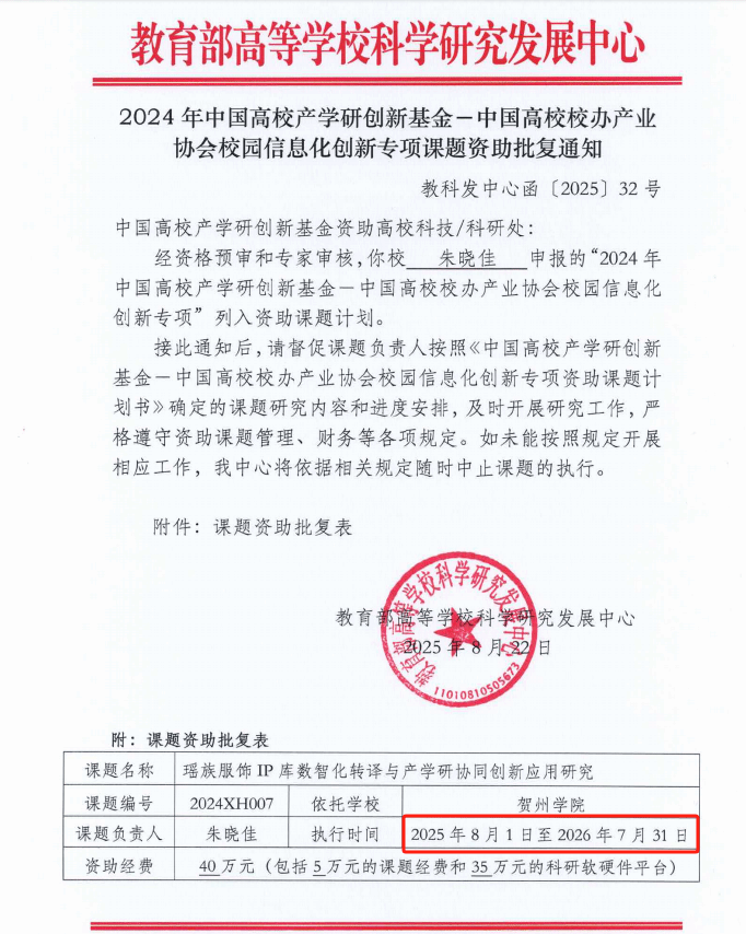 近日,教育部高等学校科学研究发展中心与中国高校校办产业协会联合设立的 “2024 年中国高校产学研创新基金 —— 中国高校校办产业协会校园信息化创新专项” 课题资助批复通知正式发布。朱晓佳申报的《瑶族服饰IP库数智化转译与产学研协同创新应用研究》成功列入资助课题计划。