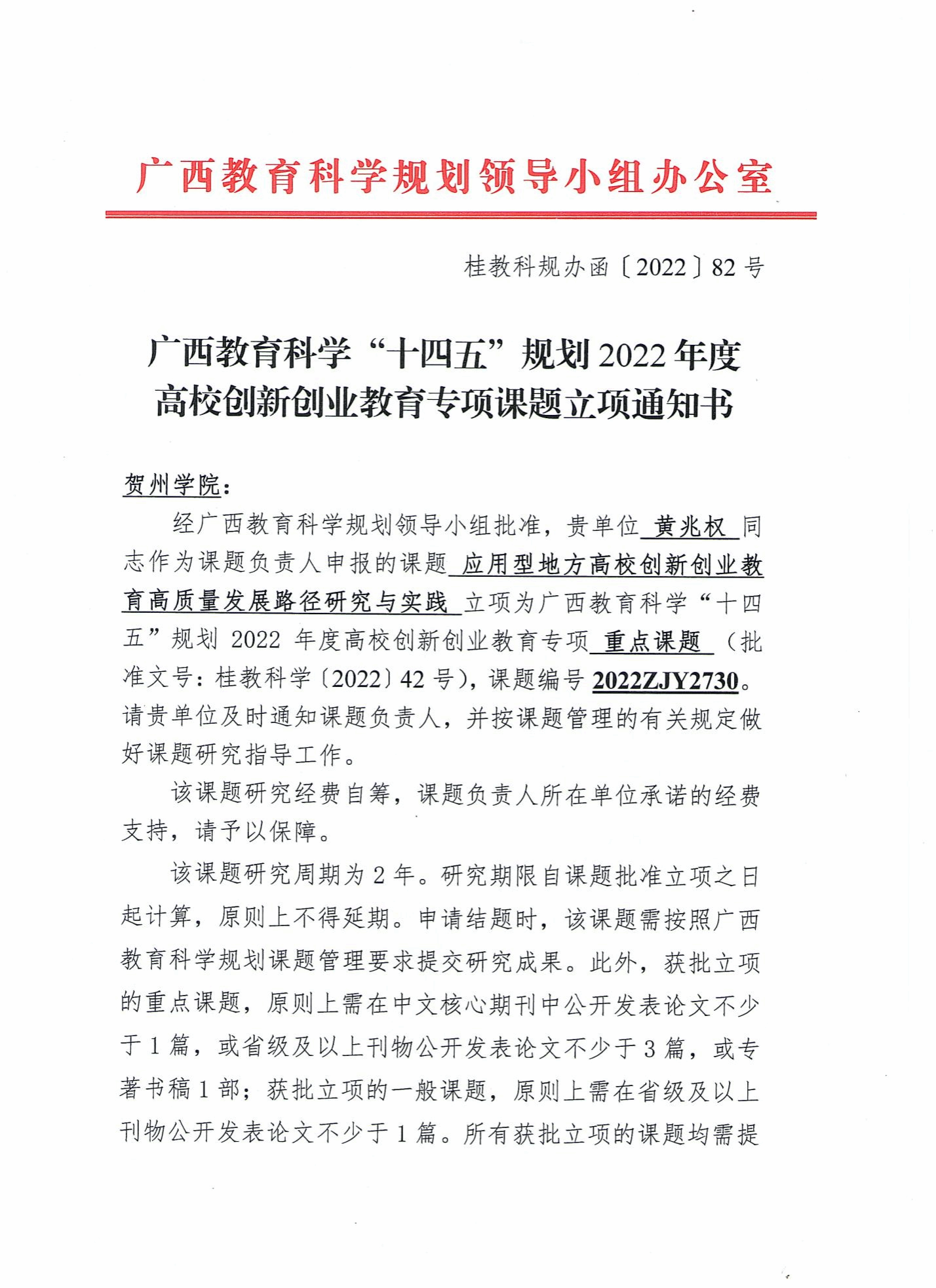 黄兆权申报的《应用型地方高校创新创业教育高质量发展路径研究与实践》成功获批立项。